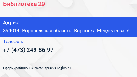 Библиотека №29 по адресу 394014, Воронежская область, Воронеж, Менделеева, 6 в дальнейшем Организация, размещена в следующих категориях: