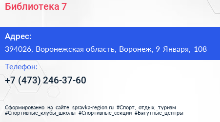 Библиотека №7 по адресу 394026, Воронежская область, Воронеж, 9 Января, 108 в дальнейшем Организация, размещена в следующих категориях:
