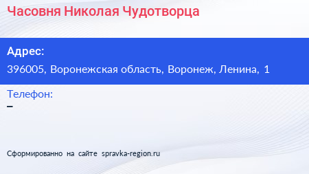 Часовня Николая Чудотворца по адресу 396005, Воронежская область, Воронеж, Ленина, 1 в дальнейшем Организация, размещена в следующих категориях: