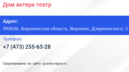 Дом актера, театр по адресу 394036, Воронежская область, Воронеж, Дзержинского, 5 в дальнейшем Организация, размещена в следующих категориях: