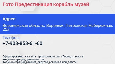Гото Предестинация, корабль-музей по адресу Воронежская область, Воронеж, Петровская Набережная, 21а в дальнейшем Организация, размещена в следующих категориях: