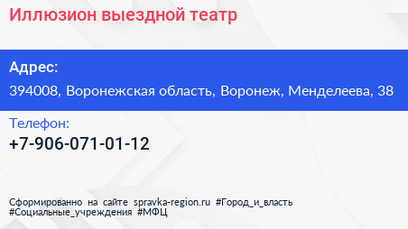 Иллюзион, выездной театр по адресу 394008, Воронежская область, Воронеж, Менделеева, 38 в дальнейшем Организация, размещена в следующих категориях: