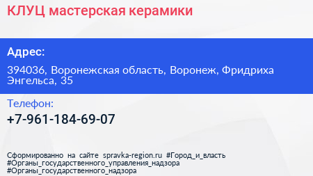 КЛУЦ, мастерская керамики по адресу 394036, Воронежская область, Воронеж, Фридриха Энгельса, 35 в дальнейшем Организация, размещена в следующих категориях: