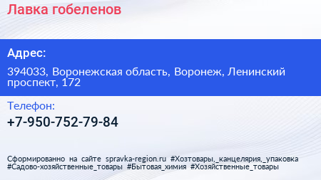 Лавка гобеленов по адресу 394033, Воронежская область, Воронеж, Ленинский проспект, 172 в дальнейшем Организация, размещена в следующих категориях: