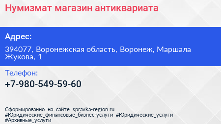 Нумизмат, магазин антиквариата по адресу 394077, Воронежская область, Воронеж, Маршала Жукова, 1 в дальнейшем Организация, размещена в следующих категориях: