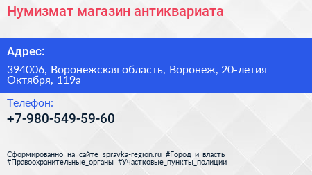 Нумизмат, магазин антиквариата по адресу 394006, Воронежская область, Воронеж, 20-летия Октября, 119а в дальнейшем Организация, размещена в следующих категориях: