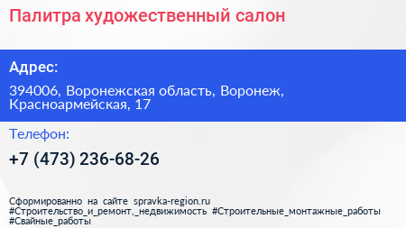 Палитра, художественный салон по адресу 394006, Воронежская область, Воронеж, Красноармейская, 17 в дальнейшем Организация, размещена в следующих категориях: