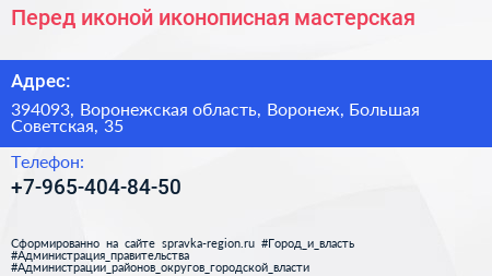 Перед иконой, иконописная мастерская по адресу 394093, Воронежская область, Воронеж, Большая Советская, 35 в дальнейшем Организация, размещена в следующих категориях: