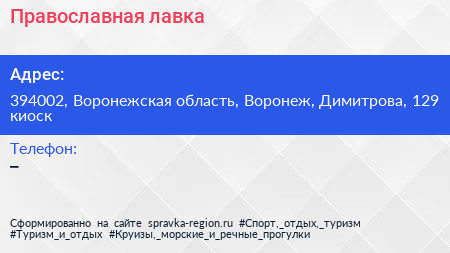 Православная лавка по адресу 394002, Воронежская область, Воронеж, Димитрова, 129 киоск в дальнейшем Организация, размещена в следующих категориях: