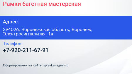 Рамки, багетная мастерская по адресу 394026, Воронежская область, Воронеж, Электросигнальная, 1а в дальнейшем Организация, размещена в следующих категориях: