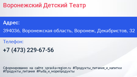 Воронежский Детский Театр по адресу 394036, Воронежская область, Воронеж, Декабристов, 32 в дальнейшем Организация, размещена в следующих категориях: