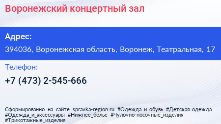Воронежский концертный зал по адресу 394036, Воронежская область, Воронеж, Театральная, 17 в дальнейшем Организация, размещена в следующих категориях: