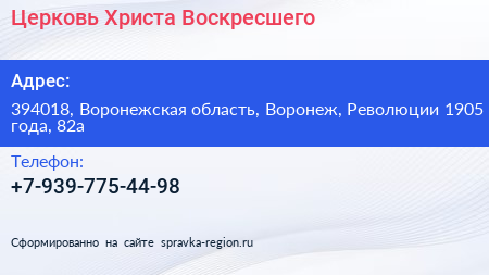 Церковь Христа Воскресшего по адресу 394018, Воронежская область, Воронеж, Революции 1905 года, 82а в дальнейшем Организация, размещена в следующих категориях: