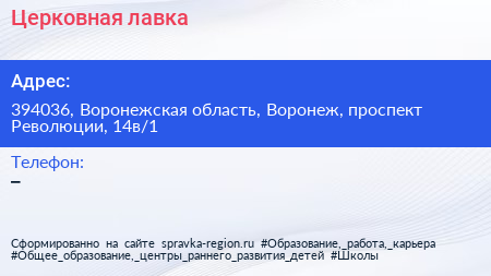Церковная лавка по адресу 394036, Воронежская область, Воронеж, проспект Революции, 14в/1 в дальнейшем Организация, размещена в следующих категориях: