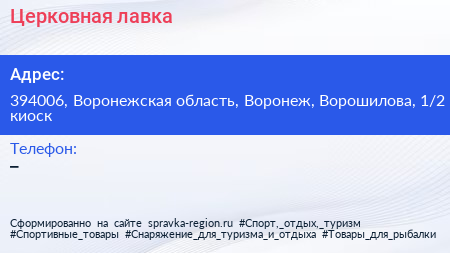 Церковная лавка по адресу 394006, Воронежская область, Воронеж, Ворошилова, 1/2 киоск в дальнейшем Организация, размещена в следующих категориях: