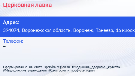 Церковная лавка по адресу 394074, Воронежская область, Воронеж, Танеева, 1а киоск в дальнейшем Организация, размещена в следующих категориях: