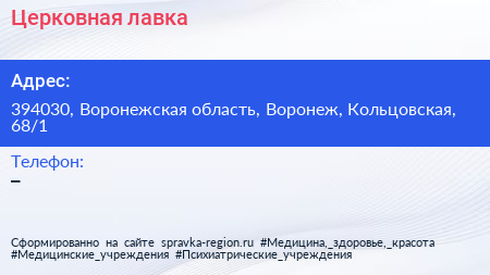 Церковная лавка по адресу 394030, Воронежская область, Воронеж, Кольцовская, 68/1 в дальнейшем Организация, размещена в следующих категориях: