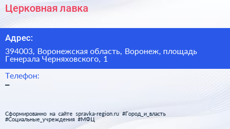 Церковная лавка по адресу 394003, Воронежская область, Воронеж, площадь Генерала Черняховского, 1 в дальнейшем Организация, размещена в следующих категориях: