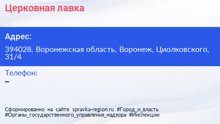 Церковная лавка по адресу 394028, Воронежская область, Воронеж, Циолковского, 31/4 в дальнейшем Организация, размещена в следующих категориях: