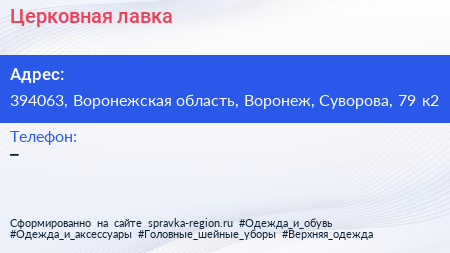 Церковная лавка по адресу 394063, Воронежская область, Воронеж, Суворова, 79 к2 в дальнейшем Организация, размещена в следующих категориях: