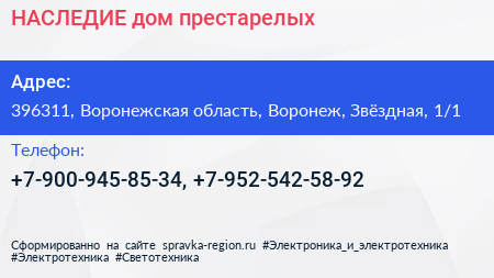 НАСЛЕДИЕ, дом престарелых по адресу 396311, Воронежская область, Воронеж, Звёздная, 1/1 в дальнейшем Организация, размещена в следующих категориях: