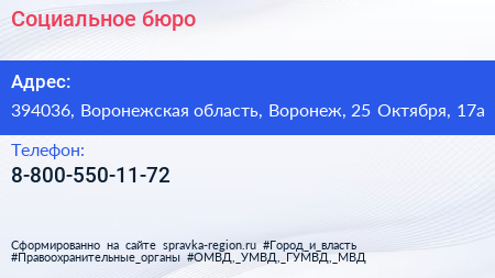 Социальное бюро по адресу 394036, Воронежская область, Воронеж, 25 Октября, 17а в дальнейшем Организация, размещена в следующих категориях: