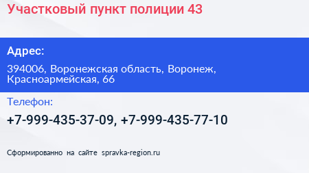 Участковый пункт полиции №43 по адресу 394006, Воронежская область, Воронеж, Красноармейская, 66 в дальнейшем Организация, размещена в следующих категориях: