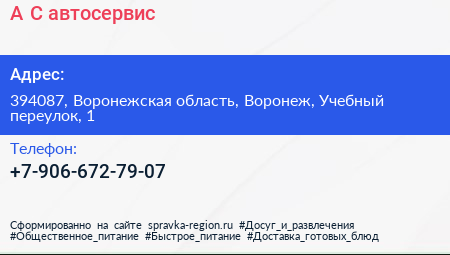 A & C, автосервис по адресу 394087, Воронежская область, Воронеж, Учебный переулок, 1 в дальнейшем Организация, размещена в следующих категориях: