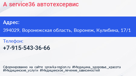 A-service36, автотехсервис по адресу 394029, Воронежская область, Воронеж, Кулибина, 17/1 в дальнейшем Организация, размещена в следующих категориях: