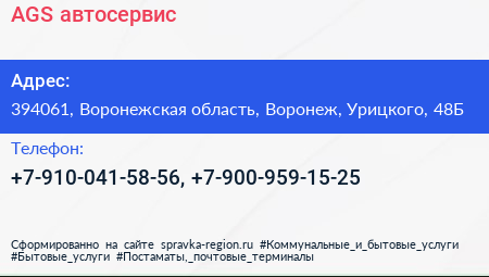 AGS, автосервис по адресу 394061, Воронежская область, Воронеж, Урицкого, 48Б в дальнейшем Организация, размещена в следующих категориях: