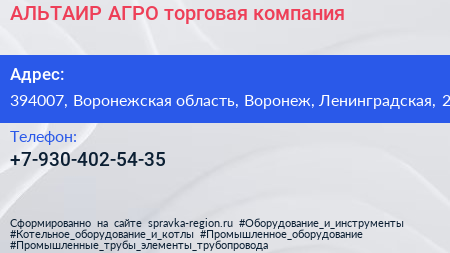 АЛЬТАИР-АГРО, торговая компания по адресу 394007, Воронежская область, Воронеж, Ленинградская, 2 в дальнейшем Организация, размещена в следующих категориях: