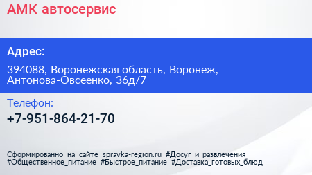 АМК, автосервис по адресу 394088, Воронежская область, Воронеж, Антонова-Овсеенко, 36д/7 в дальнейшем Организация, размещена в следующих категориях: