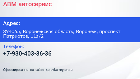 АВМ, автосервис по адресу 394065, Воронежская область, Воронеж, проспект Патриотов, 11а/2 в дальнейшем Организация, размещена в следующих категориях: