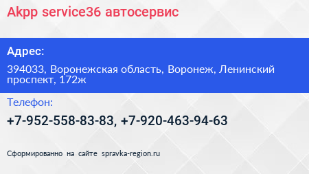 Akpp-service36, автосервис по адресу 394033, Воронежская область, Воронеж, Ленинский проспект, 172ж в дальнейшем Организация, размещена в следующих категориях: