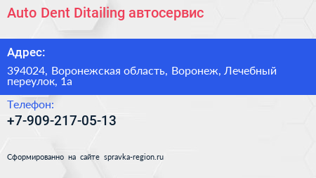 Auto Dent Ditailing, автосервис по адресу 394024, Воронежская область, Воронеж, Лечебный переулок, 1а в дальнейшем Организация, размещена в следующих категориях:
