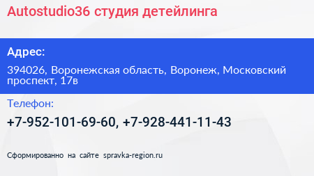 Autostudio36, студия детейлинга по адресу 394026, Воронежская область, Воронеж, Московский проспект, 17в в дальнейшем Организация, размещена в следующих категориях: