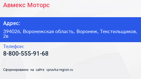 Авмекс-Моторс по адресу 394026, Воронежская область, Воронеж, Текстильщиков, 2в в дальнейшем Организация, размещена в следующих категориях:
