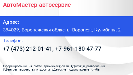 АвтоМастер, автосервис по адресу 394029, Воронежская область, Воронеж, Кулибина, 2 в дальнейшем Организация, размещена в следующих категориях: