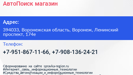 АвтоПоиск, магазин по адресу 394033, Воронежская область, Воронеж, Ленинский проспект, 174е в дальнейшем Организация, размещена в следующих категориях: