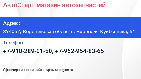 АвтоСтарт, магазин автозапчастей по адресу 394057, Воронежская область, Воронеж, Куйбышева, 64 в дальнейшем Организация, размещена в следующих категориях: