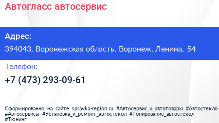Автогласс, автосервис по адресу 394043, Воронежская область, Воронеж, Ленина, 54 в дальнейшем Организация, размещена в следующих категориях: