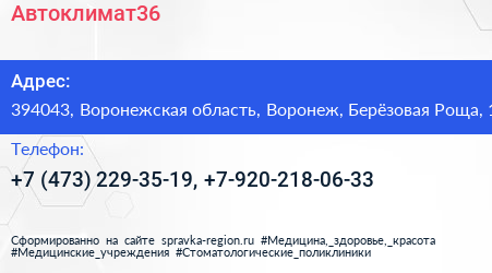 Автоклимат36 по адресу 394043, Воронежская область, Воронеж, Берёзовая Роща, 1 в дальнейшем Организация, размещена в следующих категориях: