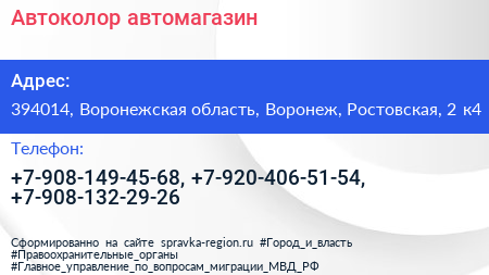 Автоколор, автомагазин по адресу 394014, Воронежская область, Воронеж, Ростовская, 2 к4 в дальнейшем Организация, размещена в следующих категориях: