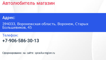 Автолюбитель, магазин по адресу 394033, Воронежская область, Воронеж, Старых Большевиков, 45 в дальнейшем Организация, размещена в следующих категориях: