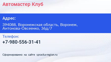 Автомастер Клуб по адресу 394088, Воронежская область, Воронеж, Антонова-Овсеенко, 36д/7 в дальнейшем Организация, размещена в следующих категориях: