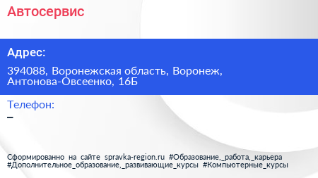 Автосервис по адресу 394088, Воронежская область, Воронеж, Антонова-Овсеенко, 16Б в дальнейшем Организация, размещена в следующих категориях: