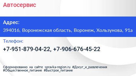 Автосервис по адресу 394016, Воронежская область, Воронеж, Хользунова, 91а в дальнейшем Организация, размещена в следующих категориях: