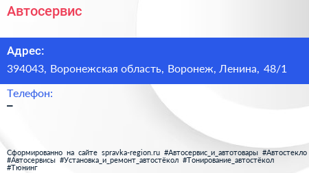 Автосервис по адресу 394043, Воронежская область, Воронеж, Ленина, 48/1 в дальнейшем Организация, размещена в следующих категориях: