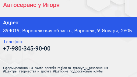 Автосервис у Игоря по адресу 394019, Воронежская область, Воронеж, 9 Января, 260Б в дальнейшем Организация, размещена в следующих категориях: