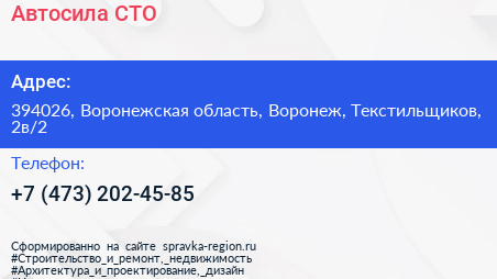 Автосила СТО по адресу 394026, Воронежская область, Воронеж, Текстильщиков, 2в/2 в дальнейшем Организация, размещена в следующих категориях: